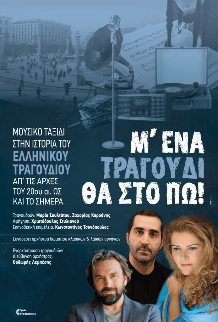 Η μουσική παράσταση «Μ ́ένα τραγούδι θα στο πω» επιχειρεί ένα μουσικό ταξίδι στην Ιστορία του Ελληνικού τραγουδιού μέσα από ιστορικά τραγούδια, ξεκινώντας από τις αρχές του 20ου αιώνα, διατρέχοντας τον μέσα από εμβληματικές δεκαετίες και φθάνοντας ως και το σήμερα. Οι τραγουδιστές Μαρία Σουλτάτου και Ζαχαρίας Καρούνης, μαζί με τον ηθοποιό Χριστόδουλος Στυλιανού στον ρόλο του αφηγητή πολύτιμοι συνοδοιπόροι, φέρνουν κοντά μας νότες, μνήμες και εποχές που μας σημάδεψαν όλους σε μία νέα ενορχηστρωτική ματιά του Θοδωρή Λεμπέση. Τη σύλληψη και σκηνοθετική επιμέλεια έχει ο Κωνσταντίνος Τσονόπουλος.